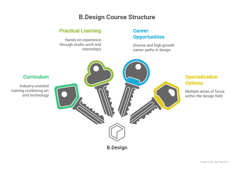 The B.Design program emphasizes practical learning, studio work, projects, internships, and portfolio development, making it an ideal choice for students with creative aptitude and visual thinking skills.
